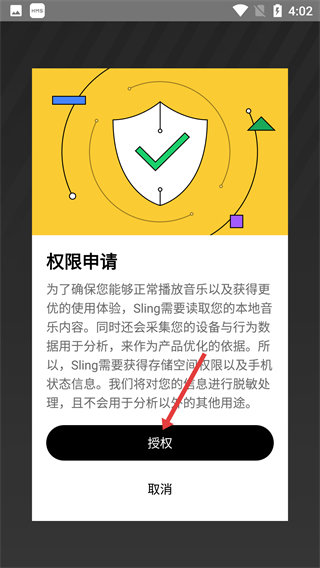 1、面對Sing的【權(quán)限申請】彈窗,點擊【授權(quán)】按鈕,允許應用讀取本地音樂、獲取存儲等權(quán)限,以正常使用音樂播放及相關(guān)功能。