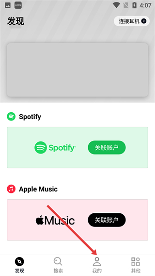 2、在“發(fā)現(xiàn)”頁面點擊底部的【我的】選項,進入個人中心頁面,可查看關(guān)聯(lián)賬戶、歌單等個人相關(guān)內(nèi)容。