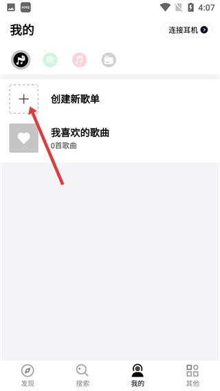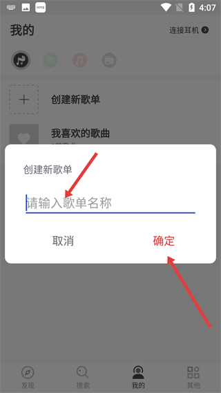 3、在“我的”頁面,點擊【創(chuàng)建新歌單】旁的加號按鈕,觸發(fā)歌單名稱輸入的彈窗。