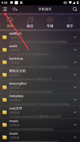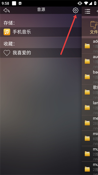 1、在“手機音樂”頁面點擊左上角的菜單按鈕,展開后進入“音源”界面,可查看存儲、收藏等音源分類內容。