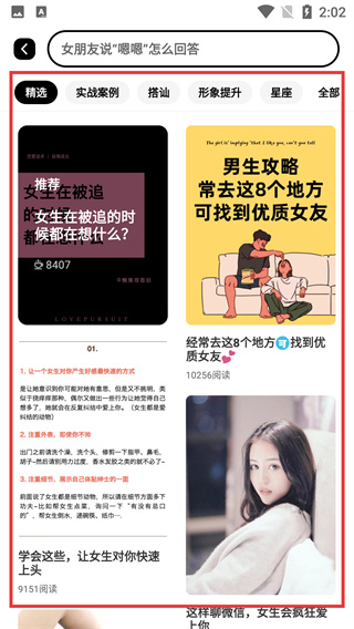 5、提供豐富案例教程資源,通過借鑒他人戀愛案例提煉實(shí)用技巧,幫助用戶系統(tǒng)學(xué)習(xí)提升戀愛能力。