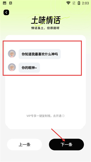 3、進(jìn)入【土味情話】模塊,查看當(dāng)前情話內(nèi)容,點(diǎn)擊【下一條】按鈕,切換更多土味情話素材,豐富聊天內(nèi)容。