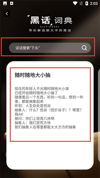 4、打開【黑話詞典】,在搜索欄輸入關(guān)鍵詞,查看如【隨時(shí)隨地大小抽】的解讀,理解聊天中的黑話含義。