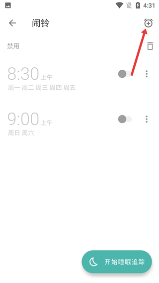 2、進(jìn)入鬧鈴頁面后,點(diǎn)擊右上角的添加鬧鈴按鈕,跳轉(zhuǎn)至鬧鈴時(shí)間的設(shè)置界面。