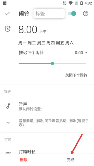 4、在鬧鈴的詳細(xì)設(shè)置頁面,配置好重復(fù)周期、鈴聲等選項(xiàng)后,點(diǎn)擊【完成】按鈕,完成該鬧鈴的創(chuàng)建。