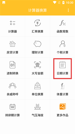 1、在計算器換算的功能列表界面,找到并點擊【日期計算】選項,進入日期計算的專屬功能頁面。