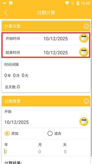 2、進入日期計算頁面后,點擊【開始時間】或【結(jié)束時間】旁的日歷圖標(biāo),打開日期選擇的彈窗界面。