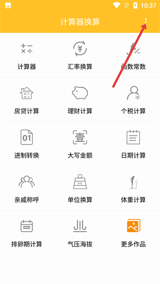 2、在計(jì)算器換算主界面,點(diǎn)擊右上角的三點(diǎn)圖標(biāo),進(jìn)入應(yīng)用的設(shè)置功能頁(yè)面。
