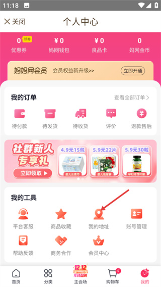 2、在個人中心頁面,找到“我的地址”選項(xiàng)并點(diǎn)擊,進(jìn)入地址管理界面,用于配置或管理收貨地址。