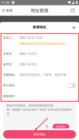 4、在新增地址頁面,填寫收貨人、手機(jī)號、地址等信息后,點(diǎn)擊“保存地址”按鈕,完成收貨地址的添加。