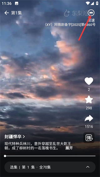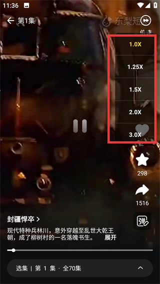 3、在短劇播放頁面,點(diǎn)擊右上角的倍速按鈕,彈出播放速度的選擇菜單,用于調(diào)整短劇的播放節(jié)奏。