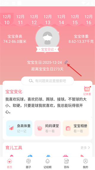 1、在“首頁(yè)”的寶寶日記區(qū)域,點(diǎn)擊“寶寶生日”旁的編輯按鈕,進(jìn)入“寶寶設(shè)置”頁(yè)面,可對(duì)寶寶的相關(guān)信息進(jìn)行配置。