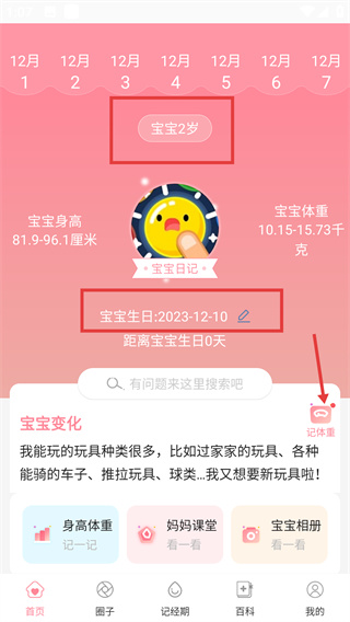 4、保存后返回首頁(yè),即可查看更新后的寶寶信息,并且對(duì)寶寶的身高、體重進(jìn)行設(shè)置,完善寶寶的信息操作。
