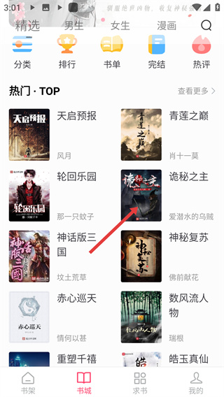 1、進(jìn)入【書城】頁(yè)面的熱門列表,選定【詭秘之主】這本小說(shuō),點(diǎn)擊進(jìn)入該作品的詳情頁(yè)面,查看書籍基礎(chǔ)信息。