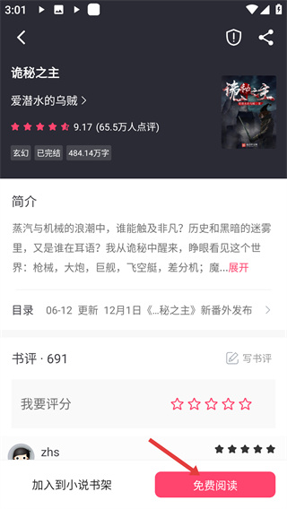 2、在【詭秘之主】的詳情頁(yè)面,點(diǎn)擊【免費(fèi)閱讀】按鈕,進(jìn)入該小說(shuō)的閱讀界面,開始閱讀內(nèi)容。