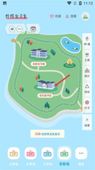 1、進入“檸檬自習室”的在職島界面,選擇“現代圖書館”建筑,進入該場所對應的閱覽室選擇頁面。