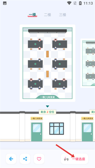 2、在圖書館頁面中,選定目標閱覽室,查看剩余空位后,點擊“一鍵選座”完成自習座位的選定。
