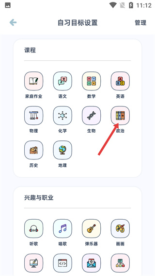 3、進入自習目標設置頁面,在“課程”分類下選擇“政治”科目,進入該科目的自習參數配置界面。