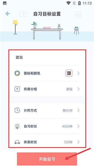 4、在政治科目的自習設置頁面,確認圖標、計時方式、自習時長等參數后,點擊“開始自習”按鈕,啟動對應的自習任務。