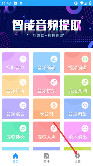 1、在智能音頻提取的首頁,點擊底部導航欄的“設(shè)置”選項,進入應(yīng)用的設(shè)置頁面,該頁面包含賬戶、幫助、消息通知等功能入口。
