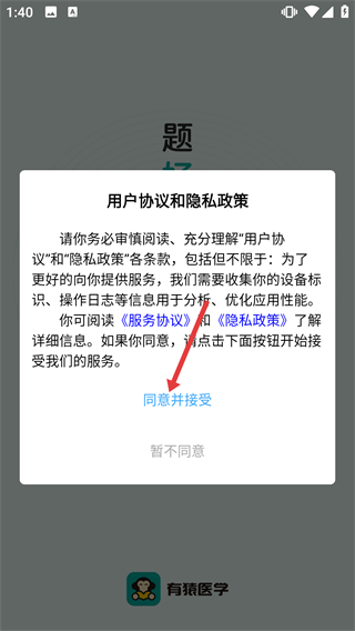1、進(jìn)入軟件后會(huì)彈出【用戶協(xié)議和隱私政策】,需閱讀【服務(wù)協(xié)議】與【隱私政策】,點(diǎn)擊【同意并接受】按鈕以繼續(xù)使用軟件相關(guān)功能。
