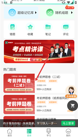 3、進(jìn)入【題庫(kù)】頁(yè)面后,點(diǎn)擊【考前押題卷(二試)】強(qiáng)化備考準(zhǔn)備。