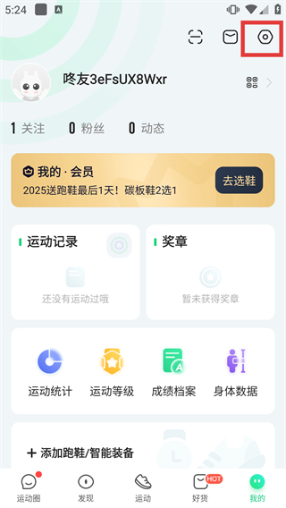 1、在個人頁面可查看運動記錄等信息,點擊右上角【設(shè)置】圖標(biāo),進(jìn)入軟件的設(shè)置功能界面,以便調(diào)整各類運動相關(guān)配置。