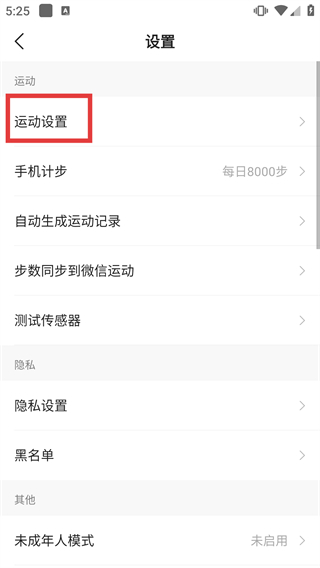 2、進(jìn)入設(shè)置頁面后,找到【運動設(shè)置】選項并點擊,該選項可進(jìn)入運動相關(guān)的具體配置界面,調(diào)整賽事語音等功能。
