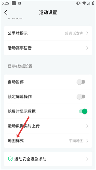 3、在運動設(shè)置頁面,可調(diào)整公里牌提示等功能,找到【地圖樣式】選項并點擊,進(jìn)入對應(yīng)的地圖顯示設(shè)置界面。