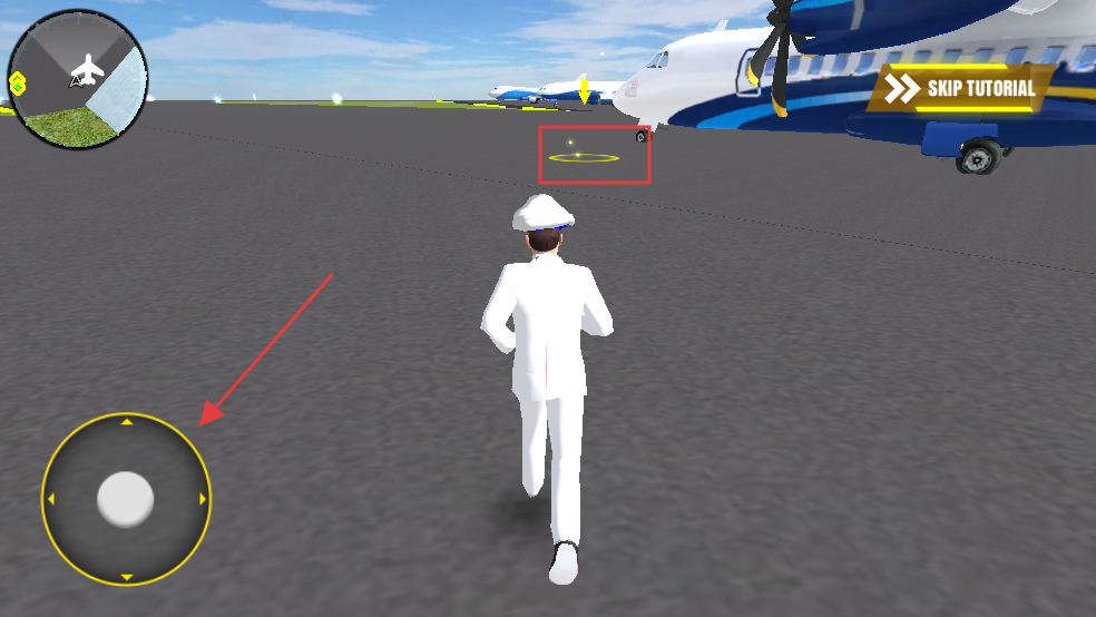 2、進入關(guān)卡后,操控左下角虛擬搖桿移動角色,朝著黃色光圈位置前進,靠近停在機場的飛機。