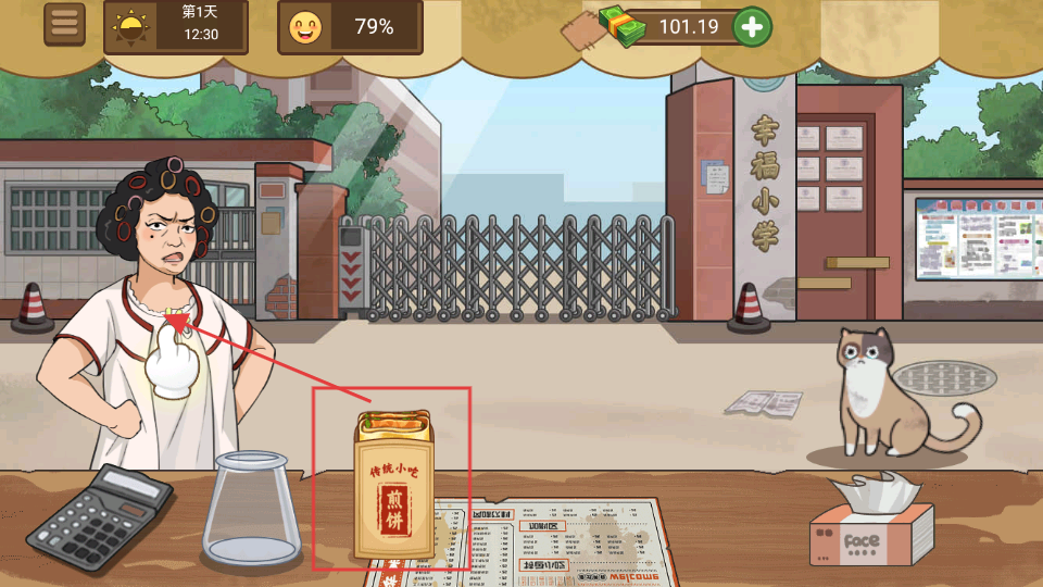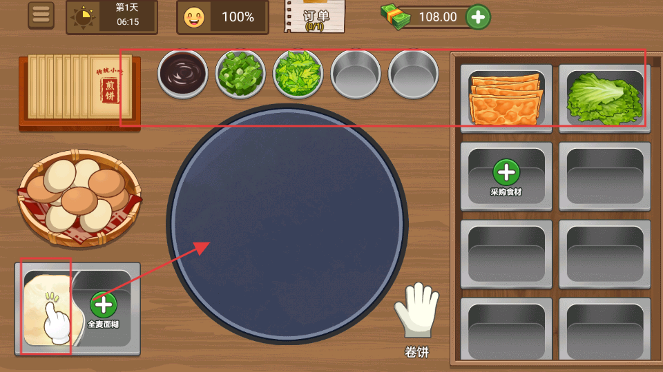 4、煎餅制作完成后,將包裝好的煎餅遞給顧客,完成訂單交付,獲得收益,繼續(xù)經(jīng)營啦。