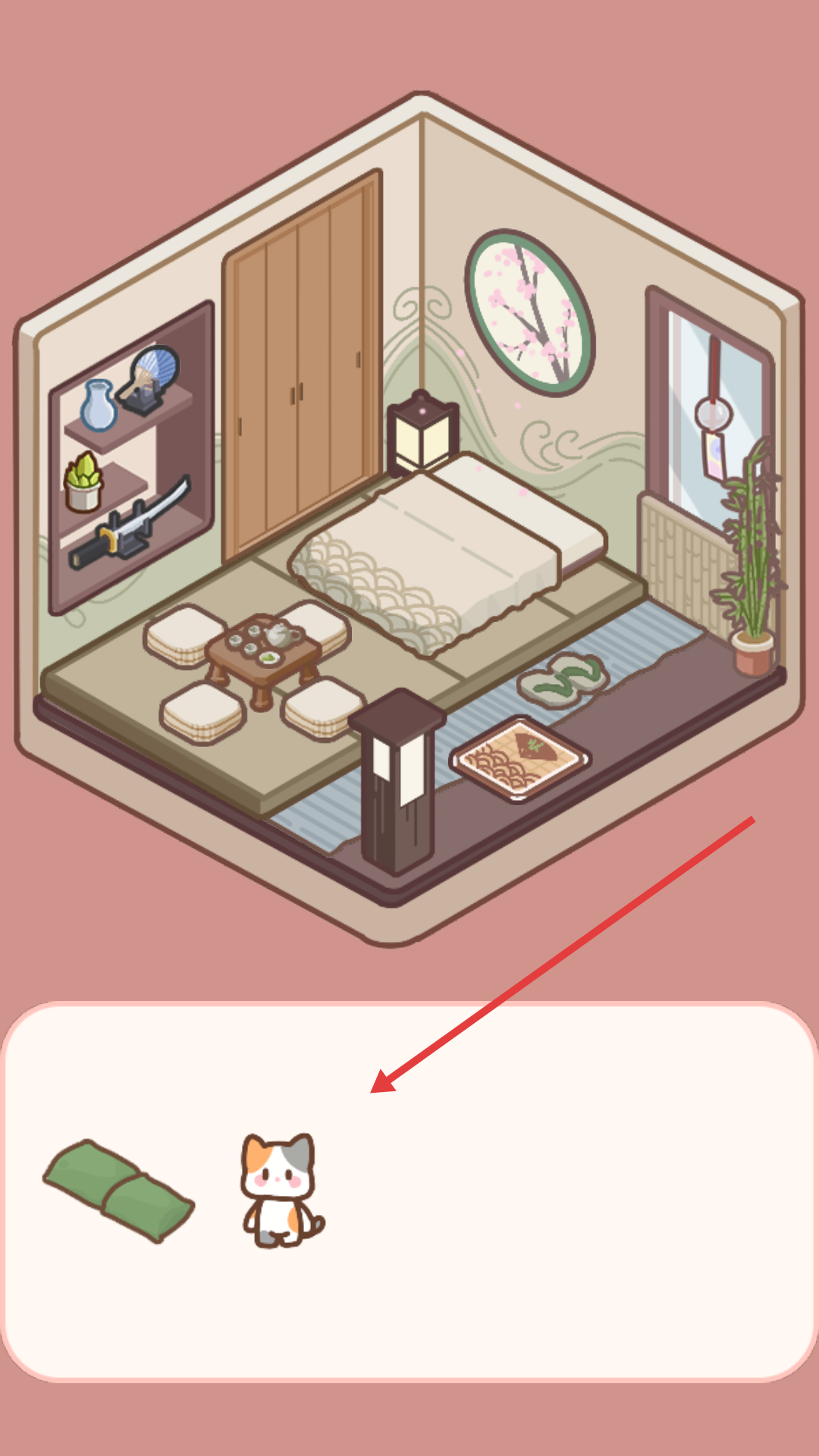 3、繼續(xù)選擇其他裝飾元素(如小貓、枕頭等),豐富房間內(nèi)容,完善布置。