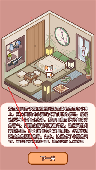4、房間布置完成后,查看劇情描述,點擊【下一關】按鈕,進入下一個關卡。