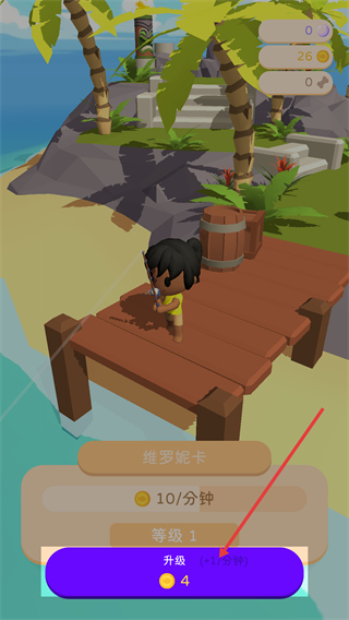 4、建造完成后,點擊【升級】按鈕,花費4金幣提升釣魚助手的等級,增加金幣收益速度。