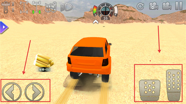 2、駕駛時(shí)用左側(cè)方向鍵控制轉(zhuǎn)向,右側(cè)按鍵操作車輛,拾取場(chǎng)景中【金鎊+50】道具可積累資源。