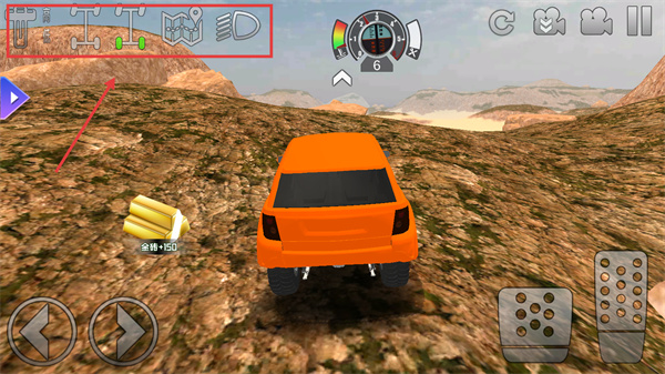 3、注意上方儀表顯示的車輛狀態(tài),在復(fù)雜地形行駛時(shí),通過(guò)頂部功能按鈕調(diào)整車輛參數(shù)以提升通過(guò)率。