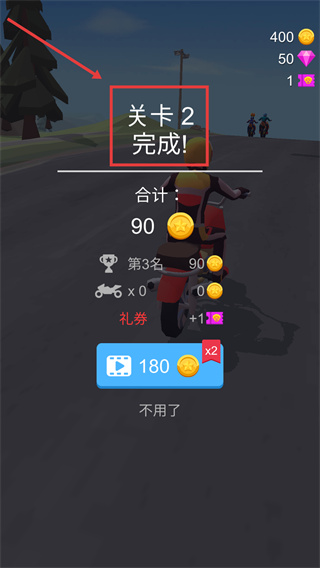 4、完成【關卡2】后,可獲得【合計-90】金幣等獎勵,選擇觀看廣告能獲取雙倍金幣,助力后續(xù)升級。