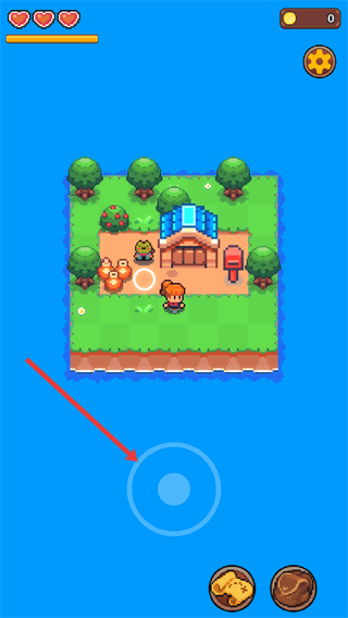 2、進入小島場景后,通過下方的移動按鈕操控角色移動,探索包含房屋、樹木的區(qū)域。