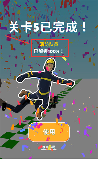 4、完成后會解鎖【消防隊(duì)員-已解鎖100%】,點(diǎn)擊【使用】可切換該角色,后續(xù)關(guān)卡能體驗(yàn)其專屬造型。