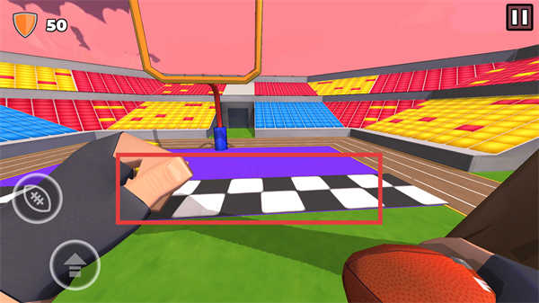 3、繼續(xù)操控橄欖球前進(jìn),穿過黑白格區(qū)域,向終點(diǎn)的球門方向推進(jìn)。