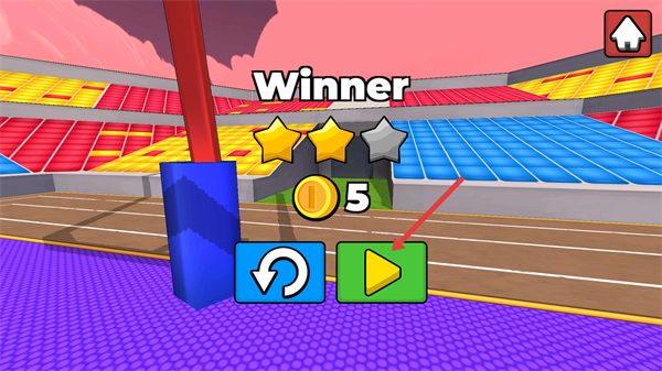4、通關(guān)后獲得【5-金幣】與星級評價(jià),點(diǎn)擊綠色播放按鈕,進(jìn)入下一個(gè)關(guān)卡挑戰(zhàn)。